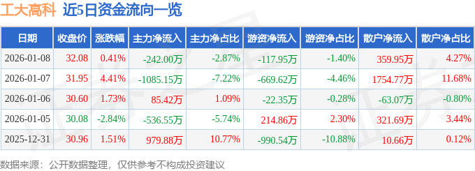 证券之星消息,截至2026年1月8日收盘,工大高科(688367)报收于32.08元,上涨0.41%,换手率3.03%,成交量2.65万手,成交额8431.97万元。