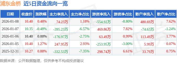 证券之星消息,截至2026年1月8日收盘,浦东金桥(600639)报收于10.4元,上涨0.48%,换手率0.71%,成交量6.06万手,成交额6305.21万元。