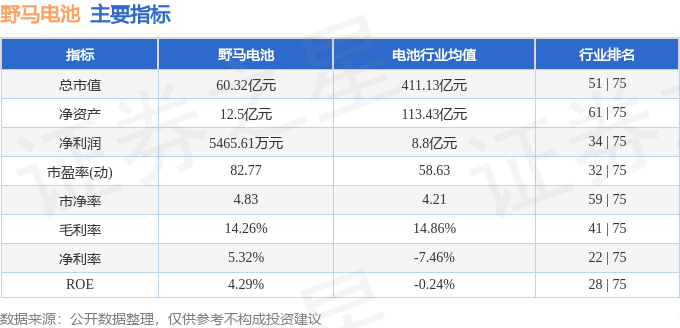 野马电池2025年三季报显示,前三季度公司主营收入10.28亿元,同比上升8.15%;归母净利润5465.61万元,同比下降53.24%;扣非净利润4738.99万元,同比下降56.37%;其中2025年第三季度,公司单季度主营收入4.43亿元,同比上升4.37%;单季度归母净利润2403.01万元,同比下降50.58%;单季度扣非净利润2301.94万元,同比下降50.61%;负债率21.79%,投资收益686.43万元,财务费用-493.87万元,毛利率14.26%。野马电池(605378)主营业务:高性能、环保锌锰电池的研发、生产和销售。