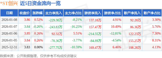 证券之星消息,截至2026年1月8日收盘,*ST创兴(600193)报收于3.86元,上涨0.52%,换手率1.69%,成交量7.21万手,成交额2791.51万元。