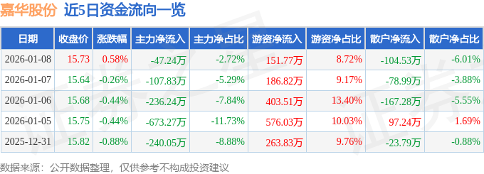 证券之星消息,截至2026年1月8日收盘,嘉华股份(603182)报收于15.73元,上涨0.58%,换手率0.67%,成交量1.11万手,成交额1739.88万元。
