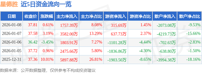 证券之星消息,截至2026年1月8日收盘,星德胜(603344)报收于37.81元,上涨0.61%,换手率10.69%,成交量5.78万手,成交额2.18亿元。