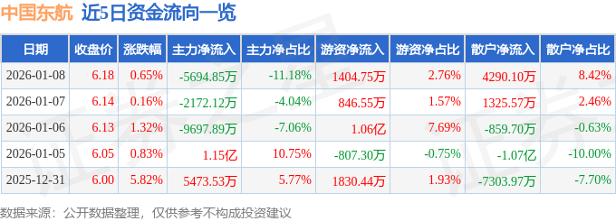 证券之星消息,截至2026年1月8日收盘,中国东航(600115)报收于6.18元,上涨0.65%,换手率0.49%,成交量82.78万手,成交额5.1亿元。