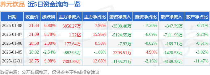 证券之星消息,截至2026年1月8日收盘,养元饮品(603156)报收于31.34元,上涨0.8%,换手率1.25%,成交量15.73万手,成交额4.87亿元。