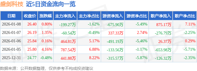 证券之星消息,截至2026年1月8日收盘,盛剑科技(603324)报收于26.4元,上涨0.8%,换手率3.15%,成交量4.66万手,成交额1.23亿元。