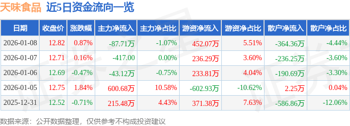 证券之星消息,截至2026年1月8日收盘,天味食品(603317)报收于12.82元,上涨0.87%,换手率0.61%,成交量6.46万手,成交额8197.98万元。