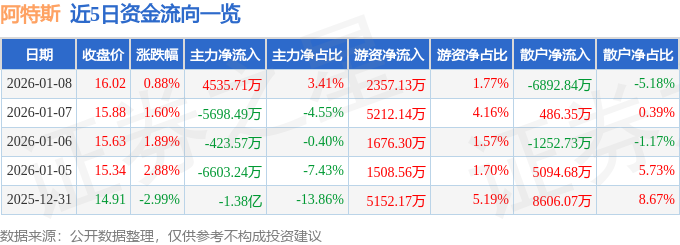 证券之星消息,截至2026年1月8日收盘,阿特斯(688472)报收于16.02元,上涨0.88%,换手率6.21%,成交量83.73万手,成交额13.31亿元。