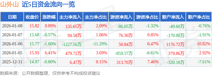 证券之星消息,截至2026年1月8日收盘,山外山(688410)报收于15.82元,上涨0.89%,换手率1.29%,成交量4.13万手,成交额6499.18万元。