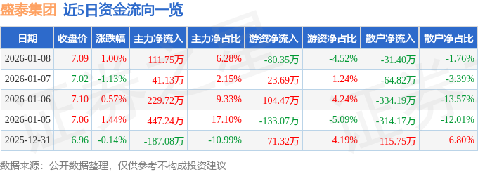 证券之星消息,截至2026年1月8日收盘,盛泰集团(605138)报收于7.09元,上涨1.0%,换手率0.45%,成交量2.51万手,成交额1779.58万元。