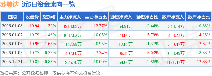 证券之星消息,截至2026年1月8日收盘,苏美达(600710)报收于10.94元,上涨1.39%,换手率1.05%,成交量13.72万手,成交额1.5亿元。
