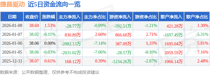 证券之星消息,截至2026年1月8日收盘,捷昌驱动(603583)报收于38.6元,上涨1.53%,换手率2.22%,成交量8.48万手,成交额3.25亿元。