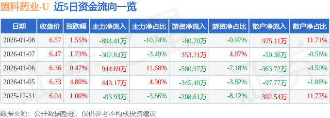 证券之星消息,截至2026年1月8日收盘,盟科药业(688373)报收于6.57元,上涨1.55%,换手率2.11%,成交量12.75万手,成交额8325.63万元。