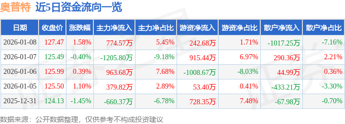证券之星消息,截至2026年1月8日收盘,奥普特(688686)报收于127.47元,上涨1.58%,换手率0.92%,成交量1.12万手,成交额1.42亿元。