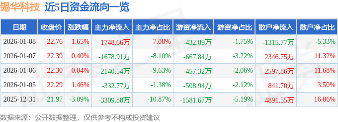 证券之星消息,截至2026年1月8日收盘,锡华科技(603248)报收于22.76元,上涨1.65%,换手率15.68%,成交量10.87万手,成交额2.47亿元。