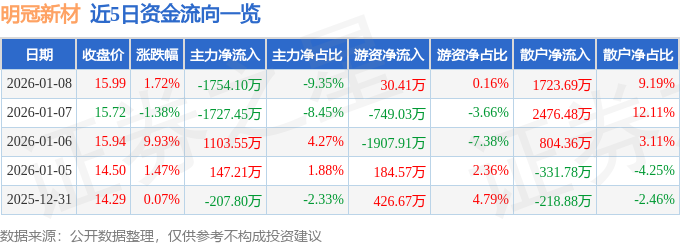 证券之星消息,截至2026年1月8日收盘,明冠新材(688560)报收于15.99元,上涨1.72%,换手率5.82%,成交量11.71万手,成交额1.88亿元。