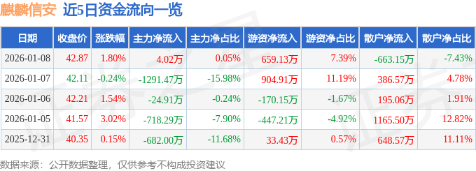 证券之星消息,截至2026年1月8日收盘,麒麟信安(688152)报收于42.87元,上涨1.8%,换手率2.03%,成交量2.09万手,成交额8923.49万元。