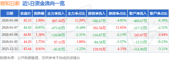 1月8日的资金流向数据方面,主力资金净流入807.34万元,占总成交额11.2%,游资资金净流出346.67万元,占总成交额4.81%,散户资金净流出460.67万元,占总成交额6.39%。