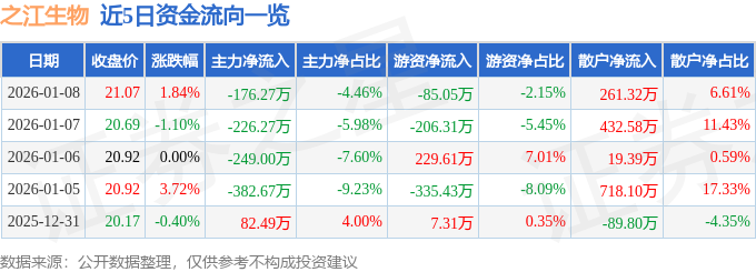 证券之星消息,截至2026年1月8日收盘,之江生物(688317)报收于21.07元,上涨1.84%,换手率0.98%,成交量1.89万手,成交额3953.31万元。