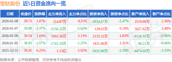 证券之星消息,截至2026年1月8日收盘,宝钛股份(600456)报收于39.73元,上涨1.87%,换手率5.66%,成交量27.06万手,成交额10.67亿元。
