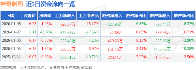 证券之星消息,截至2026年1月8日收盘,神奇制药(600613)报收于6.23元,上涨1.96%,换手率1.62%,成交量7.75万手,成交额4788.78万元。