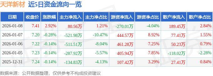 证券之星消息,截至2026年1月8日收盘,天洋新材(603330)报收于7.41元,上涨2.92%,换手率2.24%,成交量9.09万手,成交额6678.23万元。