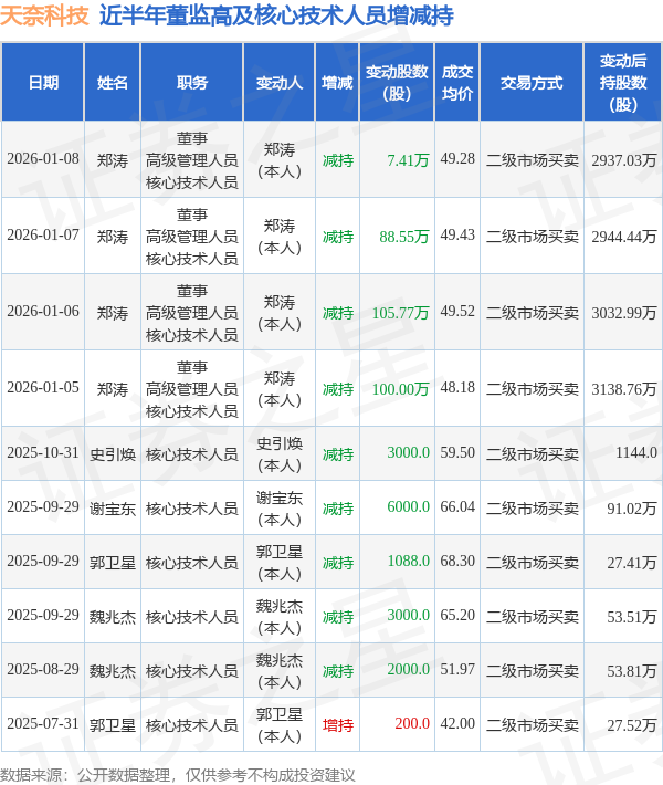 天奈科技近半年内的董监高及核心技术人员增减持详情如下: