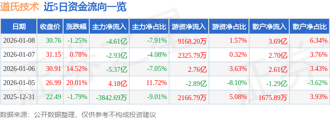 证券之星消息,截至2026年1月8日收盘,道氏技术(300409)报收于30.76元,下跌1.25%,换手率27.19%,成交量186.95万手,成交额58.27亿元。