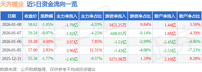 证券之星消息,截至2026年1月8日收盘,天齐锂业(002466)报收于58.62元,下跌1.05%,换手率4.72%,成交量69.63万手,成交额41.34亿元。