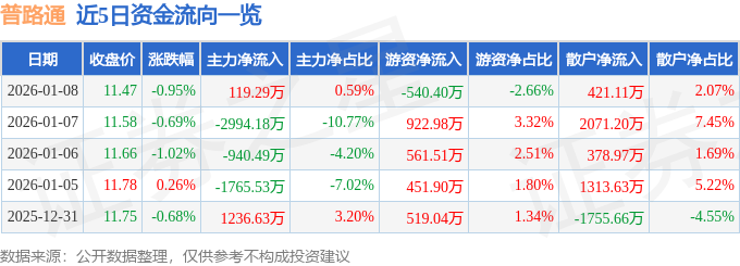 证券之星消息,截至2026年1月8日收盘,普路通(002769)报收于11.47元,下跌0.95%,换手率4.77%,成交量17.79万手,成交额2.03亿元。
