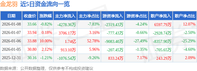 证券之星消息,截至2026年1月8日收盘,金龙羽(002882)报收于33.66元,下跌0.82%,换手率6.56%,成交量16.19万手,成交额5.46亿元。
