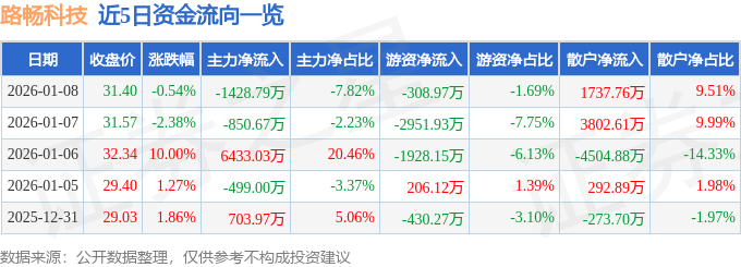 证券之星消息,截至2026年1月8日收盘,路畅科技(002813)报收于31.4元,下跌0.54%,换手率4.87%,成交量5.84万手,成交额1.83亿元。