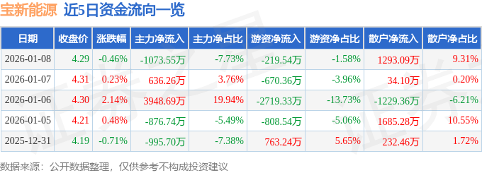 证券之星消息,截至2026年1月8日收盘,宝新能源(000690)报收于4.29元,下跌0.46%,换手率1.49%,成交量32.33万手,成交额1.39亿元。
