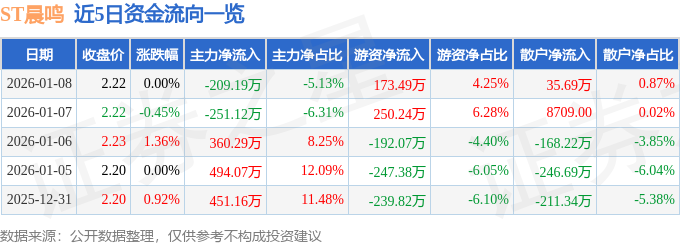 证券之星消息,截至2026年1月8日收盘,ST晨鸣(000488)报收于2.22元,上涨0.0%,换手率1.09%,成交量18.36万手,成交额4080.61万元。
