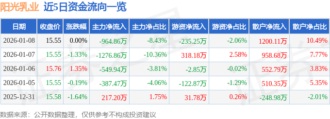 证券之星消息,截至2026年1月8日收盘,阳光乳业(001318)报收于15.55元,上涨0.0%,换手率2.62%,成交量7.4万手,成交额1.14亿元。
