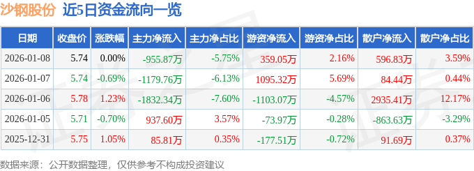 证券之星消息,截至2026年1月8日收盘,沙钢股份(002075)报收于5.74元,上涨0.0%,换手率1.32%,成交量28.97万手,成交额1.66亿元。
