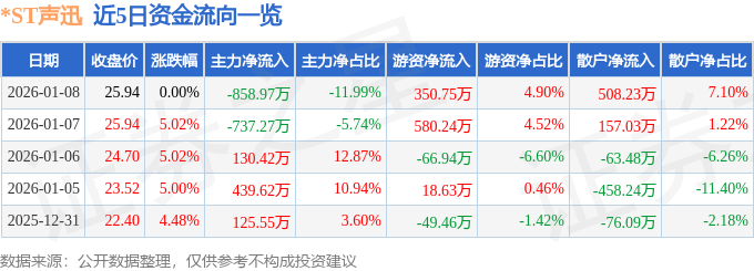 证券之星消息,截至2026年1月8日收盘,*ST声迅(003004)报收于25.94元,上涨0.0%,换手率4.05%,成交量2.78万手,成交额7161.77万元。