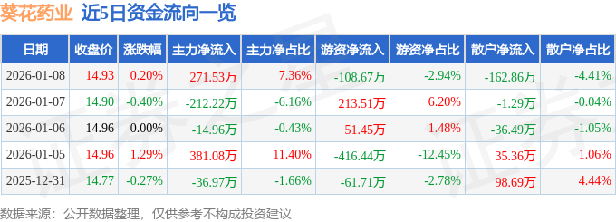 证券之星消息,截至2026年1月8日收盘,葵花药业(002737)报收于14.93元,上涨0.2%,换手率0.42%,成交量2.47万手,成交额3691.25万元。