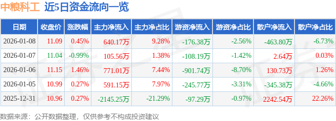 证券之星消息,截至2026年1月8日收盘,中粮科工(301058)报收于11.09元,上涨0.45%,换手率1.22%,成交量6.23万手,成交额6895.68万元。