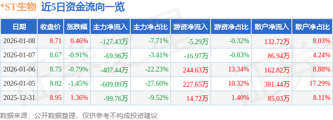 证券之星消息,截至2026年1月8日收盘,*ST生物(000504)报收于8.71元,上涨0.46%,换手率0.58%,成交量1.91万手,成交额1652.77万元。