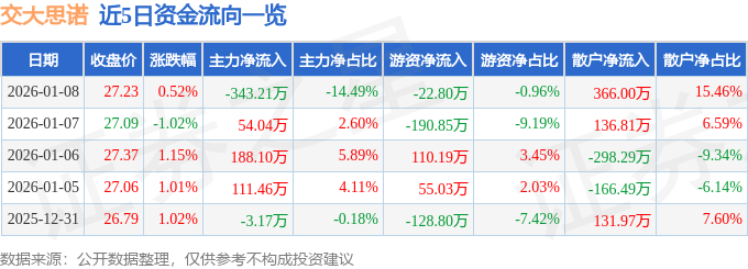 证券之星消息,截至2026年1月8日收盘,交大思诺(300851)报收于27.23元,上涨0.52%,换手率1.6%,成交量8681.0手,成交额2367.78万元。