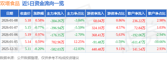 证券之星消息,截至2026年1月8日收盘,双塔食品(002481)报收于5.18元,上涨0.58%,换手率1.37%,成交量15.35万手,成交额7913.95万元。