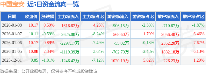 证券之星消息,截至2026年1月8日收盘,中国宝安(000009)报收于10.17元,上涨0.59%,换手率1.46%,成交量37.52万手,成交额3.8亿元。