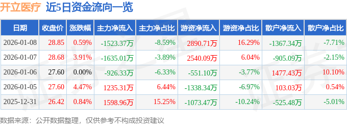 证券之星消息,截至2026年1月8日收盘,开立医疗(300633)报收于28.85元,上涨0.59%,换手率1.42%,成交量6.14万手,成交额1.77亿元。