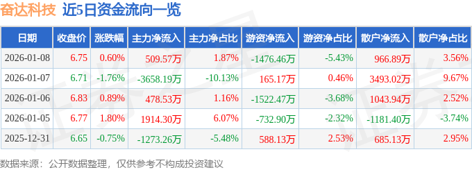 证券之星消息,截至2026年1月8日收盘,奋达科技(002681)报收于6.75元,上涨0.6%,换手率2.63%,成交量40.38万手,成交额2.72亿元。