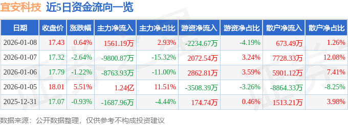 1月8日的资金流向数据方面,主力资金净流入1561.19万元,占总成交额2.93%,游资资金净流出2234.67万元,占总成交额4.19%,散户资金净流入673.49万元,占总成交额1.26%。