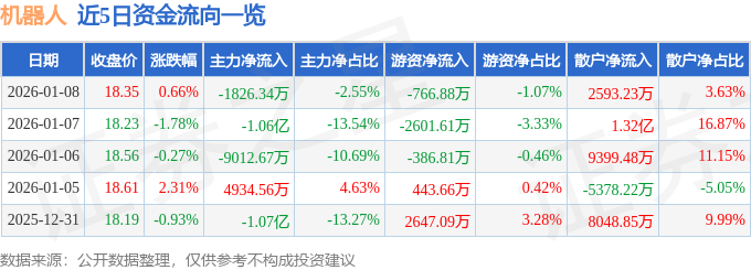 证券之星消息,截至2026年1月8日收盘,机器人(300024)报收于18.35元,上涨0.66%,换手率2.53%,成交量38.96万手,成交额7.15亿元。