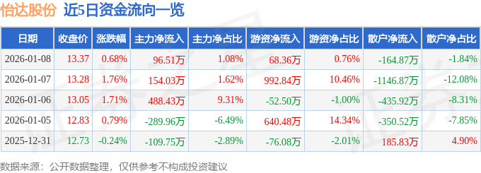 1月8日的资金流向数据方面,主力资金净流入96.51万元,占总成交额1.08%,游资资金净流入68.36万元,占总成交额0.76%,散户资金净流出164.87万元,占总成交额1.84%。