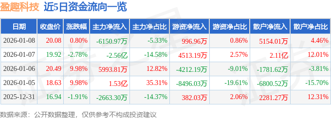 证券之星消息,截至2026年1月8日收盘,盈趣科技(002925)报收于20.08元,上涨0.8%,换手率7.85%,成交量57.86万手,成交额11.55亿元。