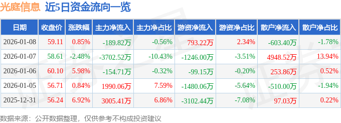 证券之星消息,截至2026年1月8日收盘,光庭信息(301221)报收于59.11元,上涨0.85%,换手率9.15%,成交量5.74万手,成交额3.39亿元。