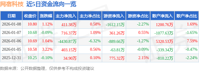 证券之星消息,截至2026年1月8日收盘,网宿科技(300017)报收于10.8元,上涨1.12%,换手率2.84%,成交量65.53万手,成交额7.09亿元。